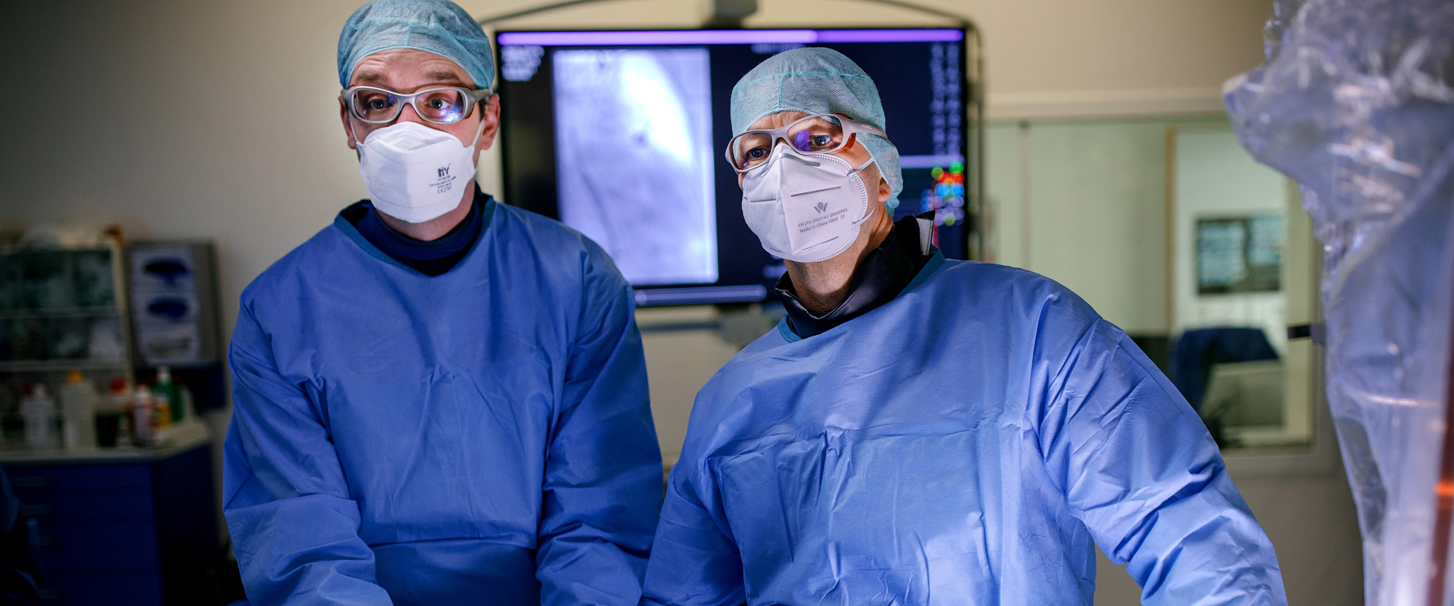 Im Bild: Prof. Dr. Georg Nickenig (Sprecher des SFB) bei der Implantation einer neuen Aortenklappe.