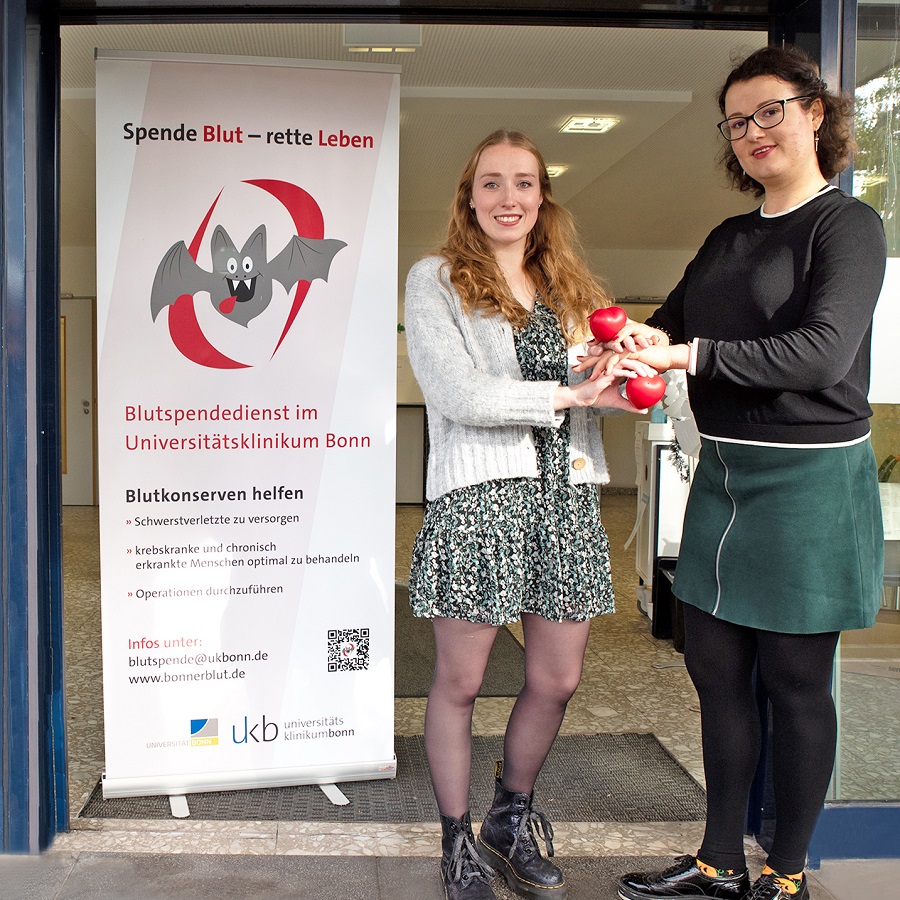 Bild: Vampire Cup 2021 auf dem Venusberg-Campus: (v.li) Die gut befreundeten Pharmazie-Studentinnen Anna Gerd-Witte und Margarita Delles freuen sich über die rege Teilnahme am diesjährigen Blutspende-Marathon.