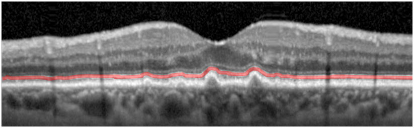 Bereits während ihrer Weiterbildungszeit hat sich Dr. med. Sarah Thiele, u.a. gefördert durch ein zweijähriges Gerok-Stipendium der BONFOR-Kommission der Medizinischen Fakultät Bonn, mit der morphologischen Charakterisierung der intermediären AMD beschäftigt. Durch die DFG-Förderung kann Dr. Thiele nun ihre Forschungsarbeiten vertiefen. Dabei wird sie sich u.a. mit der longitudinalen Analyse der sog. „Ellipsoid Zonen“-Reflektivität beschäftigen, welche sich in der hochauflösenden optischen Kohärenztomographie in-vivo darstellen (rot markiert im Beispielbild) und quantifizieren lässt und u.a. als Ausdruck der mitochondrialen Aktivität der Photorezeptoren interpretiert wird. „Gerade mit Hinblick auf degenerative Erkrankungen wie der AMD ist die Evaluation der Ellipsoid Zonen-Reflektivität ein neuer Ansatz bei der Identifikation krankheitsrelevanter Biomarker“, so Thiele.
