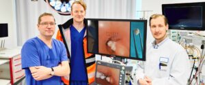 Prof. Andreas Müller, Dr. Till Dresbach, Dr. Thorsten Sendmit dem Befund einer Video-Bronchoskopie nach Aspiration (unabsichtliche Einatmung) eines vier Millimeter großen Nussstücks durch ein Kleinkind