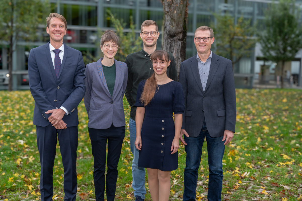 Bildunterschrift (v.l.n.r.): Prof. Nico Mutters, Direktor des Instituts für Hygiene und Öffentliche Gesundheit am UKB, Dr. Katharina Last und Dr. Anna Schwabe, beide Koordinatorinnen mre-netz regio rhein-ahr, Felix Droop, Mitarbeiter mre-netz regio rhein-ahr, und Prof. Stefan Engelhart, Krankenhaushygieniker am UKB.