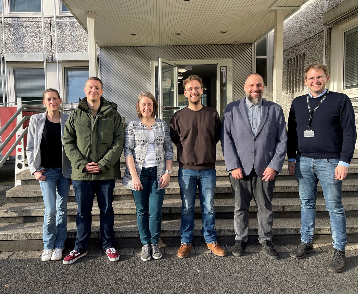 Bildunterschrift (v. l.): Interdisziplinäres Team, das künftig eine niedrigschwellige ambulante psychiatrische Versorgung wohnungsloser Menschen in Bonn anbietet: Laura Kilarski und Martin Strahl vom UKB, Laura Scharfenstein und Markus Gäntgen von der Stadt Bonn, Dr. Henrik Rohner und Thomas Schneider vom UKB.