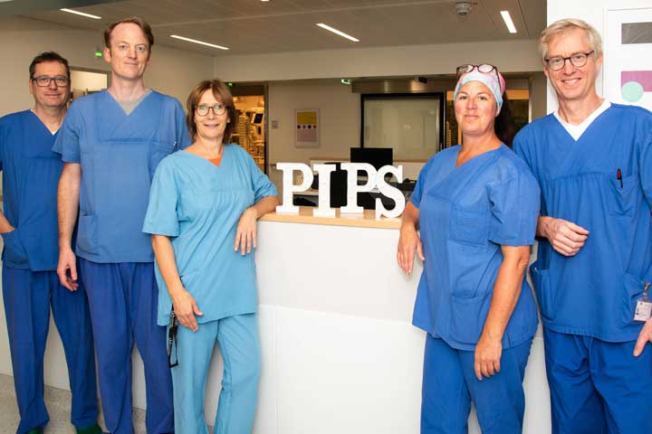 Bildunterschrift: (v. l.) Prof. Andreas Müller, Dr. Till Dresbach, Sabine Fritsche, Kathrin Stricker und Dr. Joachim Schmitt sind ab sofort in der neuen Kinder-Intensivstation des UKB für schwerkranke Kinder im Einsatz.